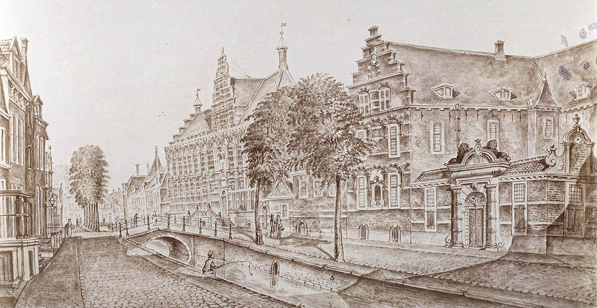 Links van de bomen in het midden: de kanselarij aan de Turfmarkt te Leeuwarden in 1849. Hier waren justitie en het Huis van Correctie in gevestigd. Johannes zat hier twee maanden in hechtenis.